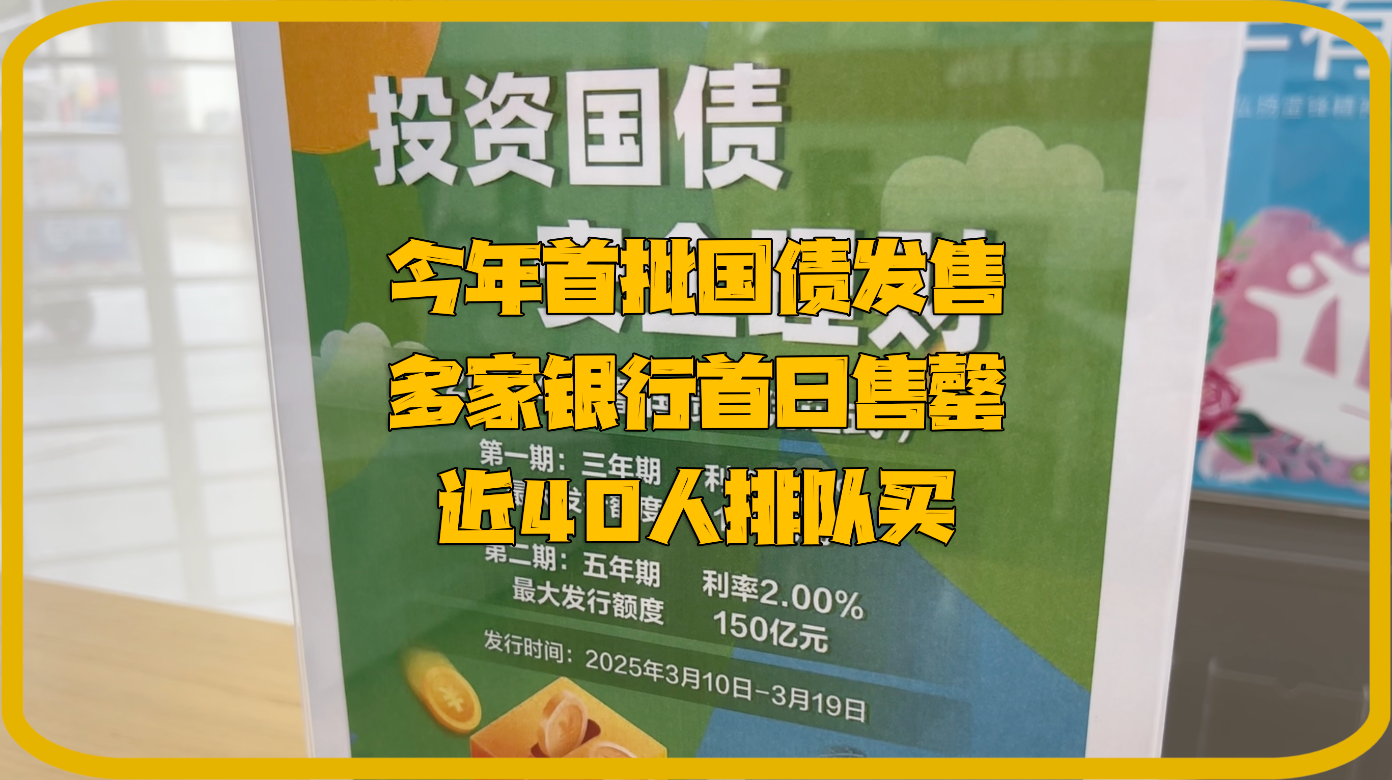 今年首批储蓄国债(凭证式)正式发行,最高利率2%。第一财经记者实地探访了多家银行了解到,多数地区农商行在国债开售首日额度就已售罄,部分股份制商业银行在开售第二日还有购买额度,且三年期售卖速度比五年期快。一家城市商业银行的工作人员告诉记者,他们网点开售早晨就已有近40人排队购买,最早的客户甚至7点就到了。