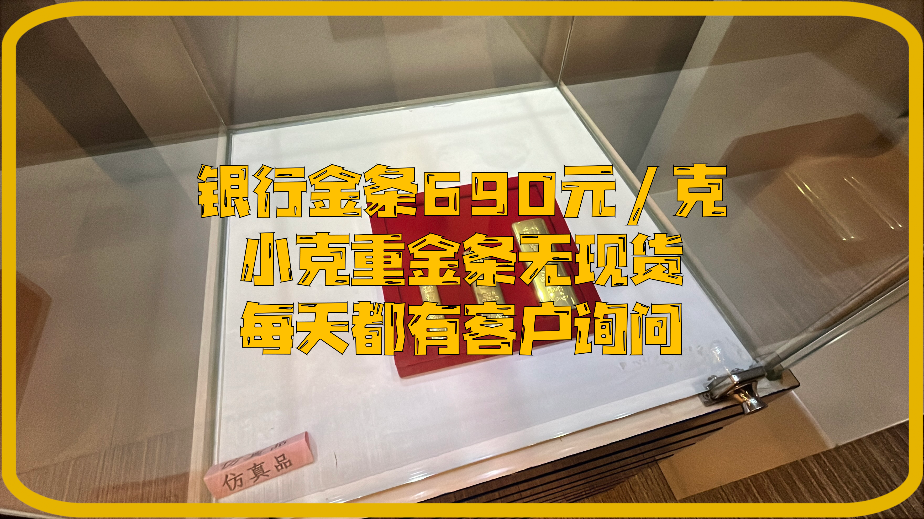 近期金价不断上涨,不少人选择购买金条作为投资商品。第一财经记者实地探访了线下银行网点发现,目前线下网点基本没有小克重金条现货可以购入,需要预约或是邮寄。有客户经理对记者表示,他们网点的金条价格目前超过690元/克,且以前有10克、20克等小克重,近期只有50克起卖。