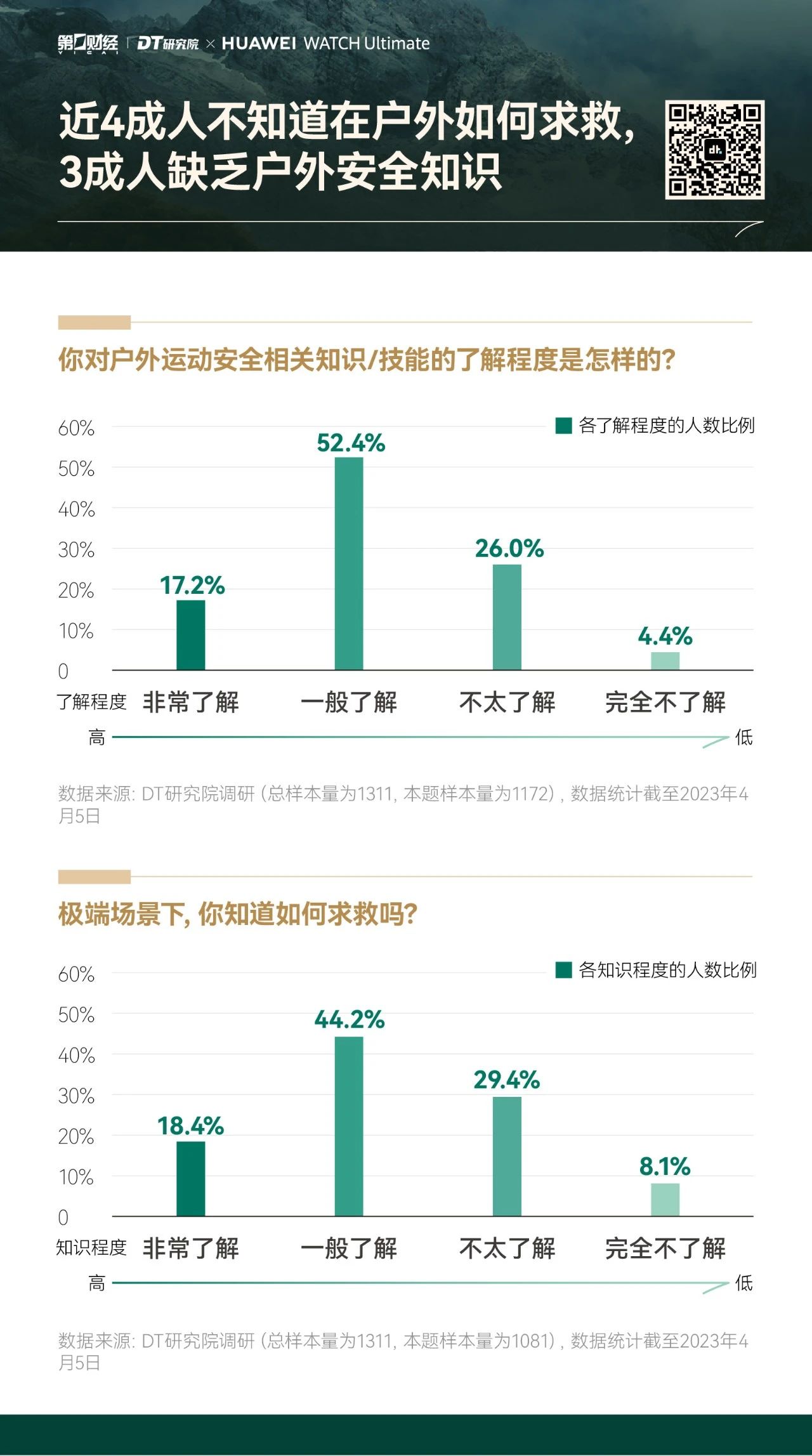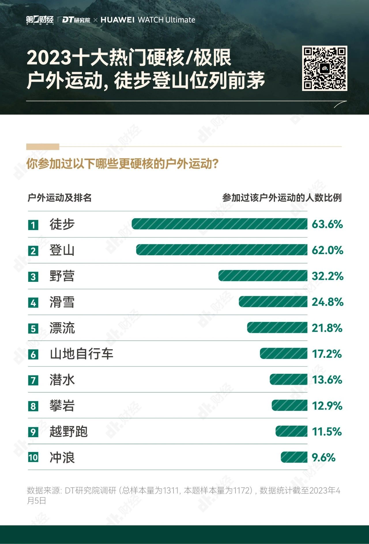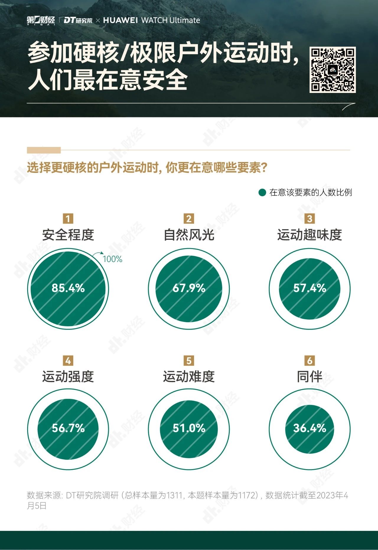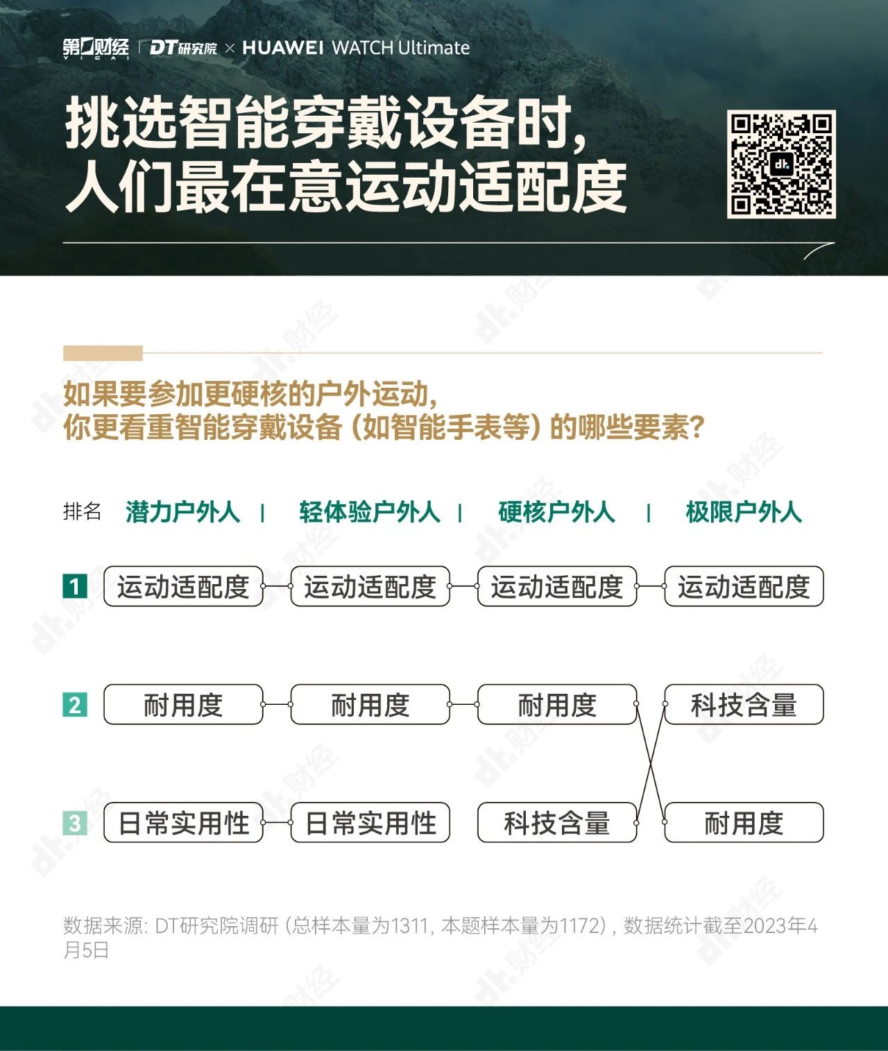 为了帮助大家更好地享受户外运动的乐趣,勇敢出发,安全回家,第一财经旗下DT研究院联合华为WATCH Ultimate 非凡大师推出《无畏前行:2023户外运动报告》,我们试图呈现的,不仅是“户外运动走向硬核”的洞察,也是一份有专业依托、有经验参考的户外运动指南。