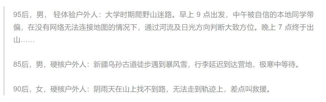 在问题“在参与更硬核户外运动的过程中,你有哪些印象深刻的事情?”下,受访者们分享的经历也大多与安全相关,要么是在户外突遇意外,要么是前期准备不足: