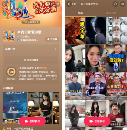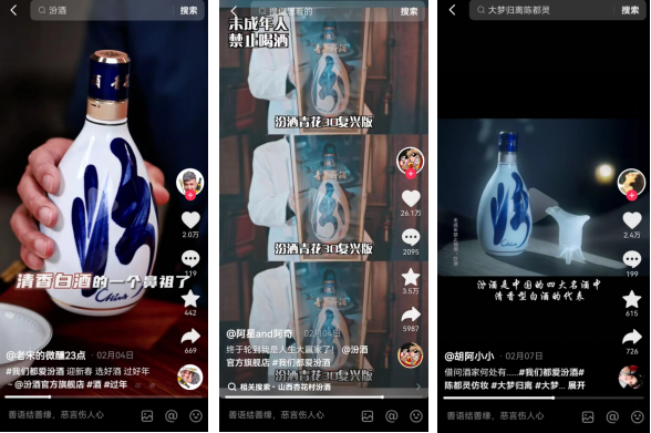 @吃货老外铁蛋儿@酒叔尝白酒@胡阿小小@阿星and阿奇@沐酥酥@黑哥好酒@安森的话事酒馆@老宋的微醺23点@失野晶@干饭小困困等横跨酒水、美食、搞笑、剧情领域的博主也都积极参与#我们都爱汾酒抖音挑战赛,用创意创新的视频展现对汾酒的青睐。