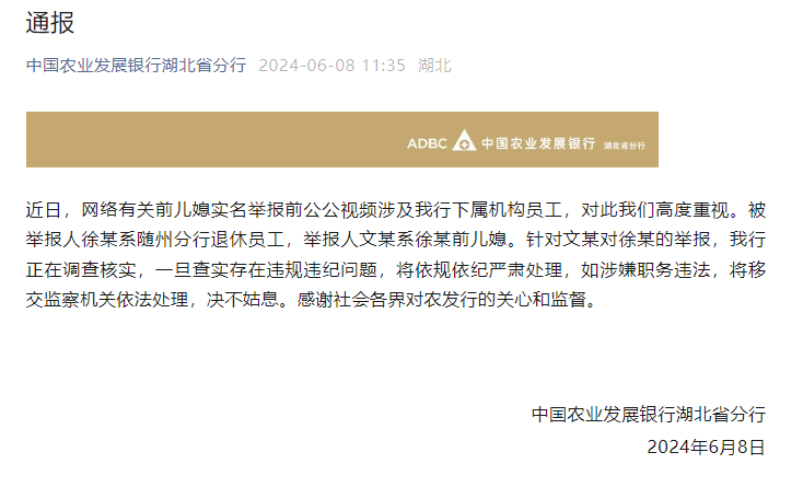 6月8日,就此前网络热议的前儿媳实名举报事件,中国农业发展银行湖北省分行发布通报,全文如下: