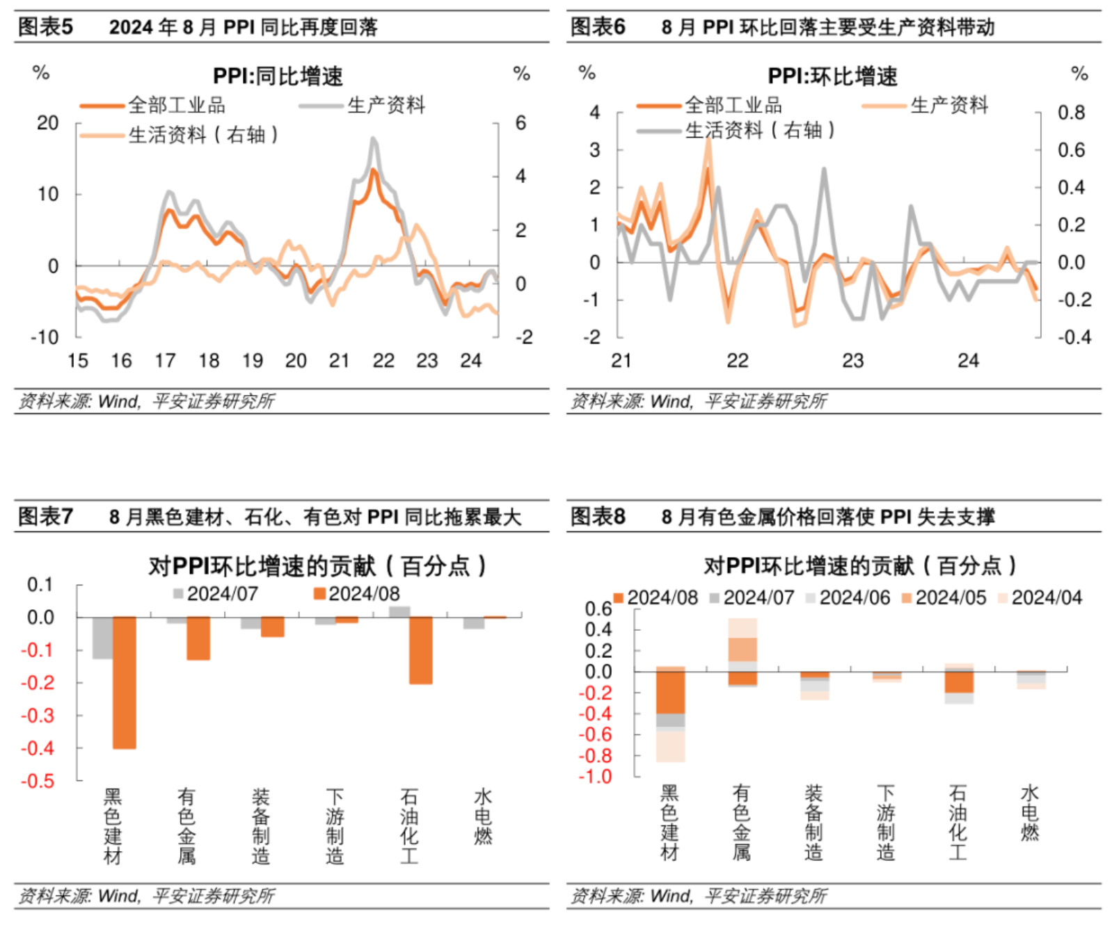 从同比看:8月PPI同比-1.8%,降幅比上月扩大1.0个百分点。其中,生产资料价格同比回落至-2%,此前四个月降幅曾连续收窄;生活资料价格同比降至-1.1%,仍处于历史低位。