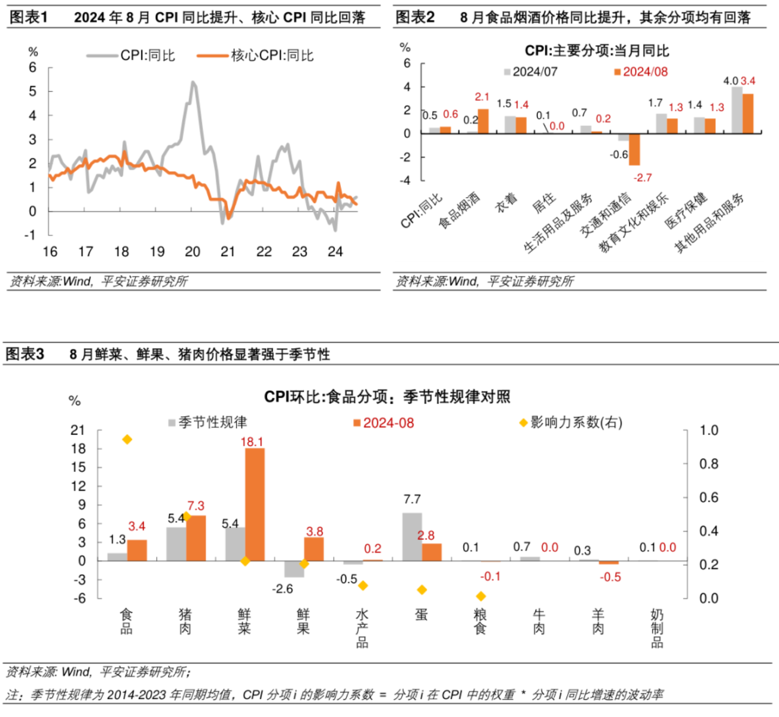 1. 食品价格继续强于季节性,鲜菜、鲜果、猪肉价格偏强。8月食品价格由上月持平转为上涨2.8%,影响CPI同比上涨约0.51个百分点。与季节性规律对照,8月鲜菜、鲜果、猪肉价格环比显著强于季节性规律。受夏季高温及局地强降雨天气等因素影响,鲜菜、鲜菌、鲜果价格分别上涨18.1%、9.8%、3.8%;生猪产能去化叠加看涨预期偏强,猪肉价格上涨7.3%。
