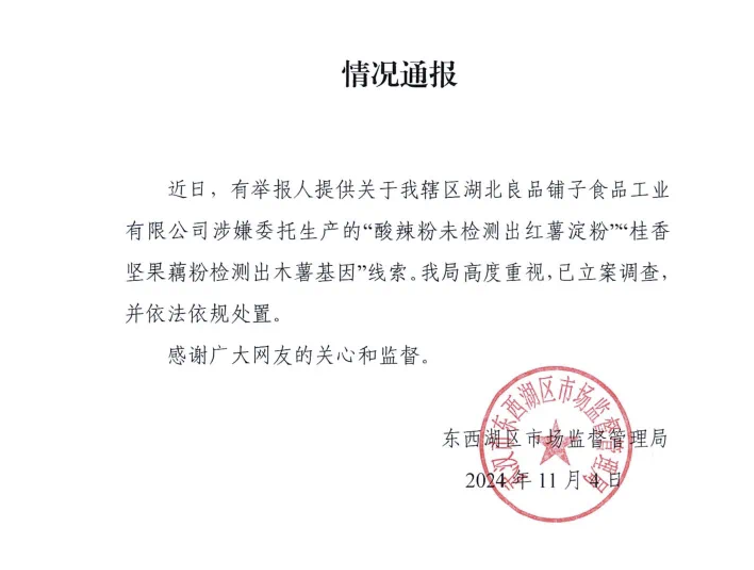 11月4日,武汉市东西湖区人民政府金银湖街道办事处微信公众号发布消息,武汉市东西湖区市场监督管理局发布情况通报,近日,有举报人提供关于东西湖辖区湖北良品铺子食品工业有限公司涉嫌委托生产的“酸辣粉未检测出红薯淀粉”“桂香坚果藕粉检测出木薯基因”线索。武汉东西湖区市场监管局表示,已立案调查,并依法依规处置。