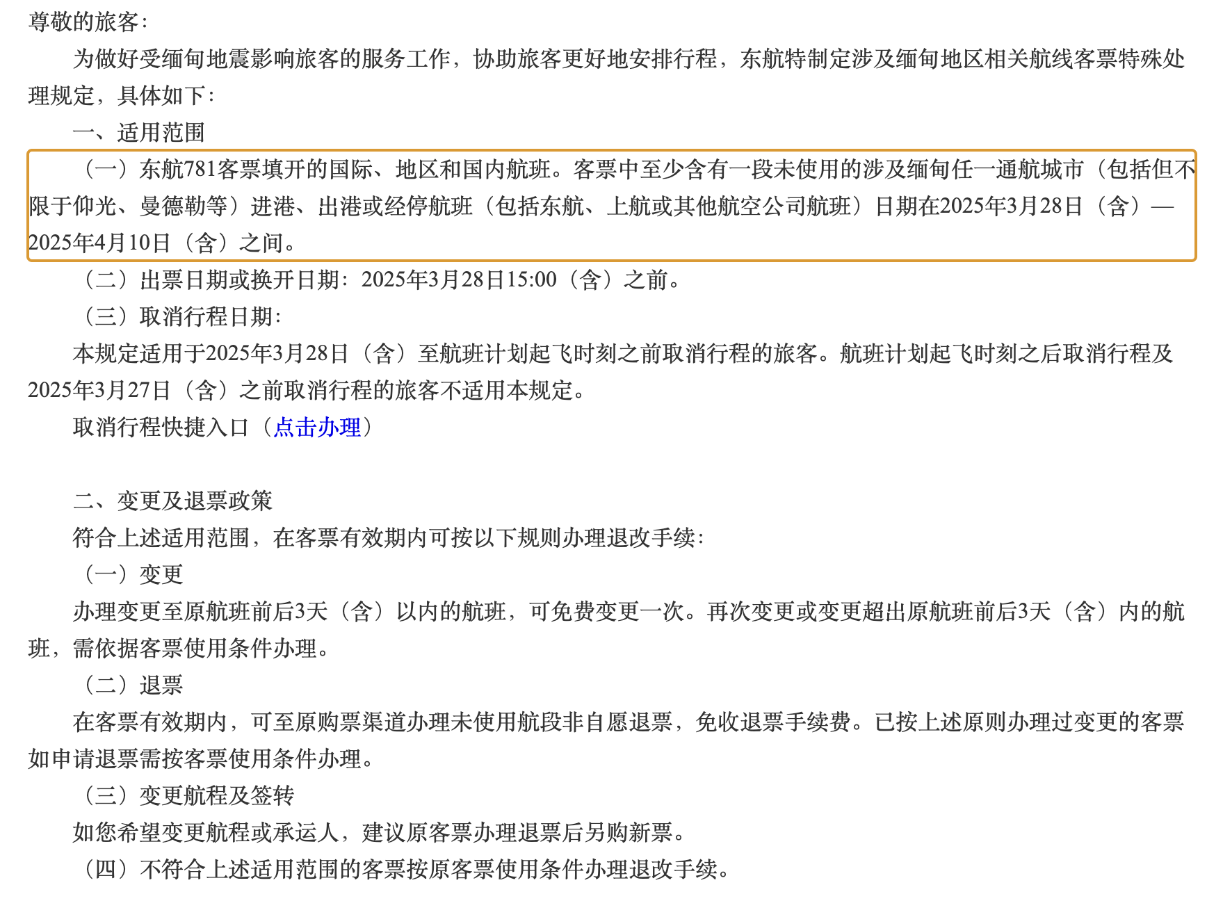 东航也发布了涉及缅甸地区相关航线客票特殊处理规定。