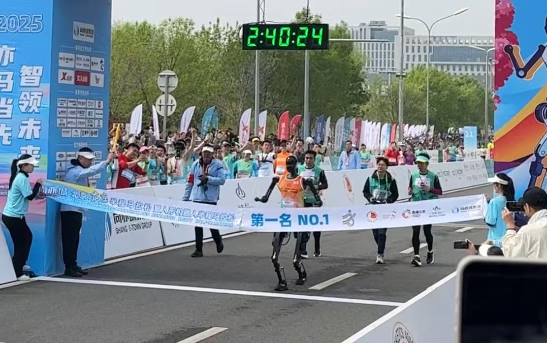 4月19日上午10:11,在人类热情的欢呼声与掌声中,身穿橙色运动背心,脚穿黑色跑鞋的天工Ultra人形机器人,以2时40分42秒的成绩第一个冲过终点线,夺得全球首个人形机器人半程马拉松赛事桂冠。