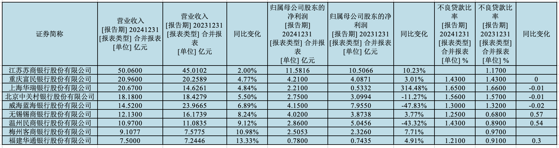 多家民营银行净利润在净息差缩窄的冲击下出现下滑。截至2024年末,尽管部分民营银行营业收入实现了正增长,但净利润却未同步提升。其中,威海蓝海银行净利润下滑47.83%,温州民商银行净利润下滑43.32%,近乎“腰斩”;北京中关村银行净利润也出现了11%的下滑。
