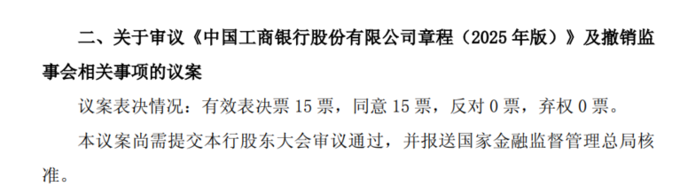 工商银行公告显示,出席会议的董事审议通过了多项议案,其中包括:审议《中国工商银行股份有限公司章程(2025年版)》及撤销监事会相关事项的议案。议案尚需提交该行股东大会审议通过,并报送国家金融监督管理总局核准。