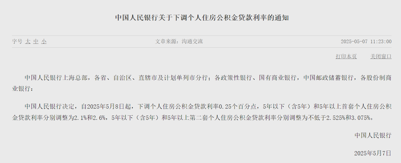 据央行网站,中国人民银行决定,自5月8日起,下调个人住房公积金贷款利率0.25个百分点,5年以下(含5年)和5年以上首套个人住房公积金贷款利率分别调整为2.1%和2.6%,5年以下(含5年)和5年以上第二套个人住房公积金贷款利率分别调整为不低于2.525%和3.075%。
