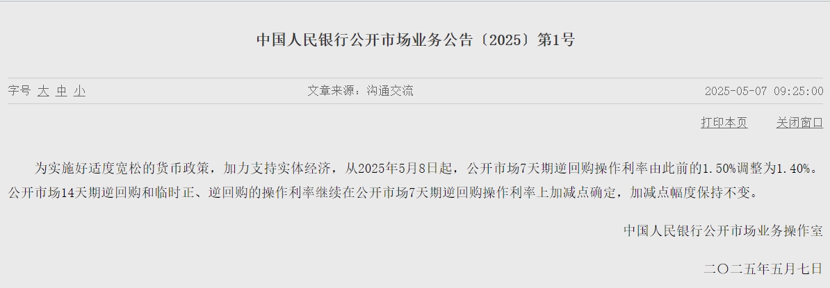 此外,央行今日早间公告,为实施好适度宽松的货币政策,加力支持实体经济,从2025年5月8日起,公开市场7天期逆回购操作利率由此前的1.50%调整为1.40%。公开市场14天期逆回购和临时正、逆回购的操作利率继续在公开市场7天期逆回购操作利率上加减点确定,加减点幅度保持不变。