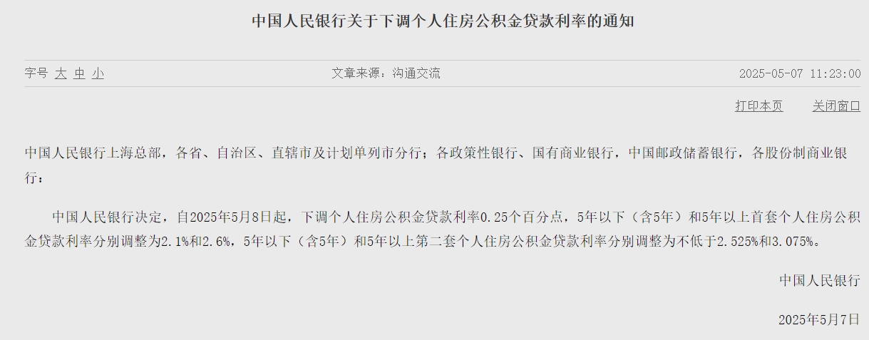 同时,央行决定,自2025年5月8日起,下调个人住房公积金贷款利率0.25个百分点,5年以下(含5年)和5年以上首套个人住房公积金贷款利率分别调整为2.1%和2.6%,5年以下(含5年)和5年以上第二套个人住房公积金贷款利率分别调整为不低于2.525%和3.075%。
