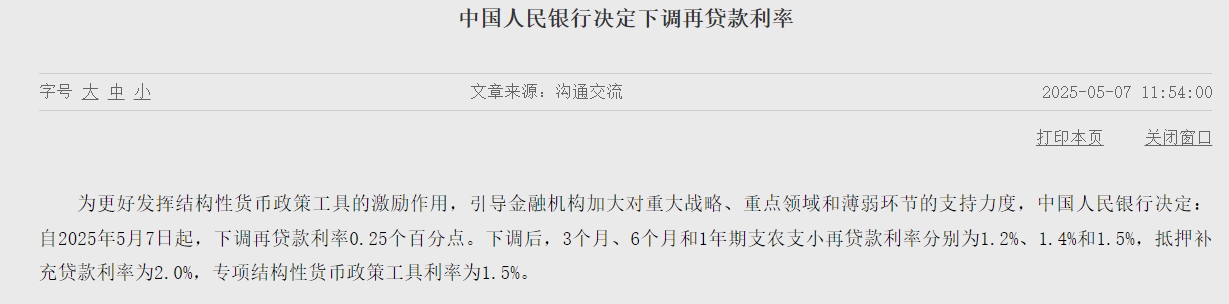 央行公告,为更好发挥结构性货币政策工具的激励作用,引导金融机构加大对重大战略、重点领域和薄弱环节的支持力度,自2025年5月7日起,下调再贷款利率0.25个百分点。下调后,3个月、6个月和1年期支农支小再贷款利率分别为1.2%、1.4%和1.5%,抵押补充贷款利率为2.0%,专项结构性货币政策工具利率为1.5%。