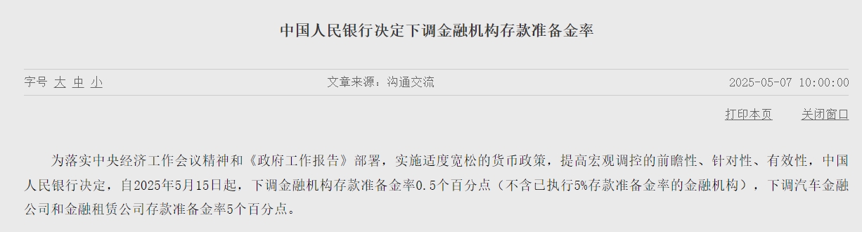 5月7日,央行公告,为落实中央经济工作会议精神和《政府工作报告》部署,实施适度宽松的货币政策,提高宏观调控的前瞻性、针对性、有效性,自2025年5月15日起,下调金融机构存款准备金率0.5个百分点(不含已执行5%存款准备金率的金融机构),下调汽车金融公司和金融租赁公司存款准备金率5个百分点。