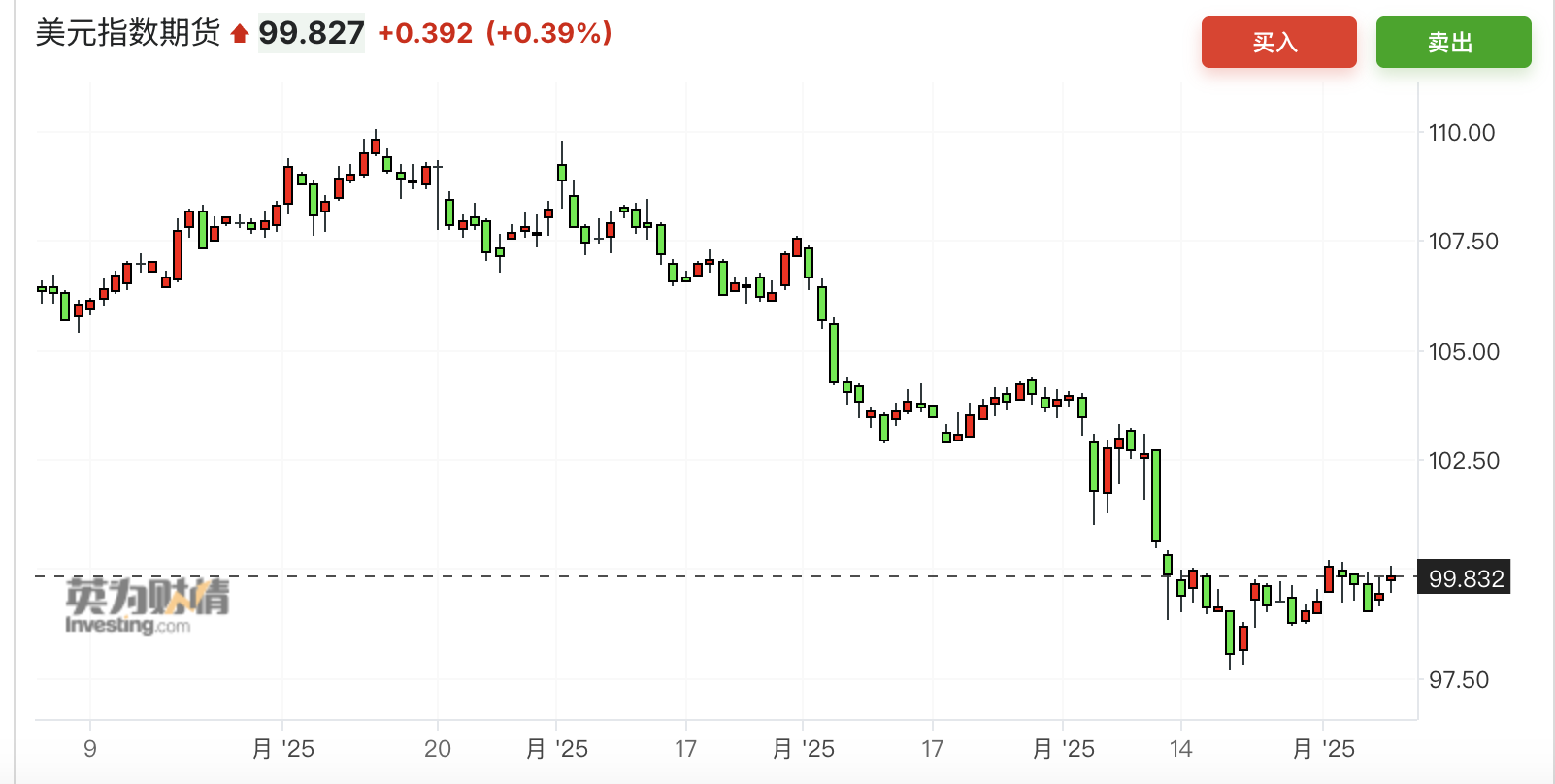 随着降息预期不断推迟,加之关税大战出现缓和,美元指数近期持续反弹至100附近,此前一度跌破98,年内最大跌幅接近10%。