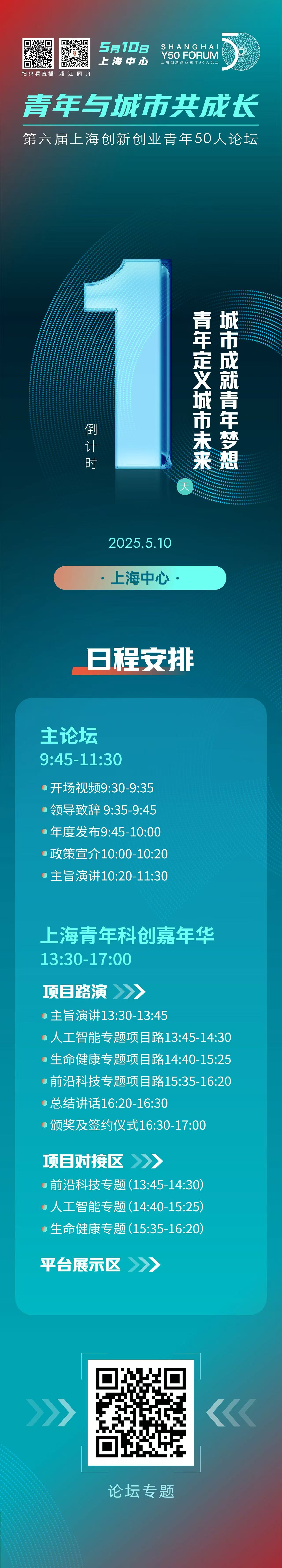 5月10日9时—17时,“浦江同舟”微信视频号与第一财经等平台将联手出“Y50大放送”伴随式直播,为您带来第六届上海创新创业青年50人论坛的主旨演讲、政策解读、科创嘉年华等精彩内容。