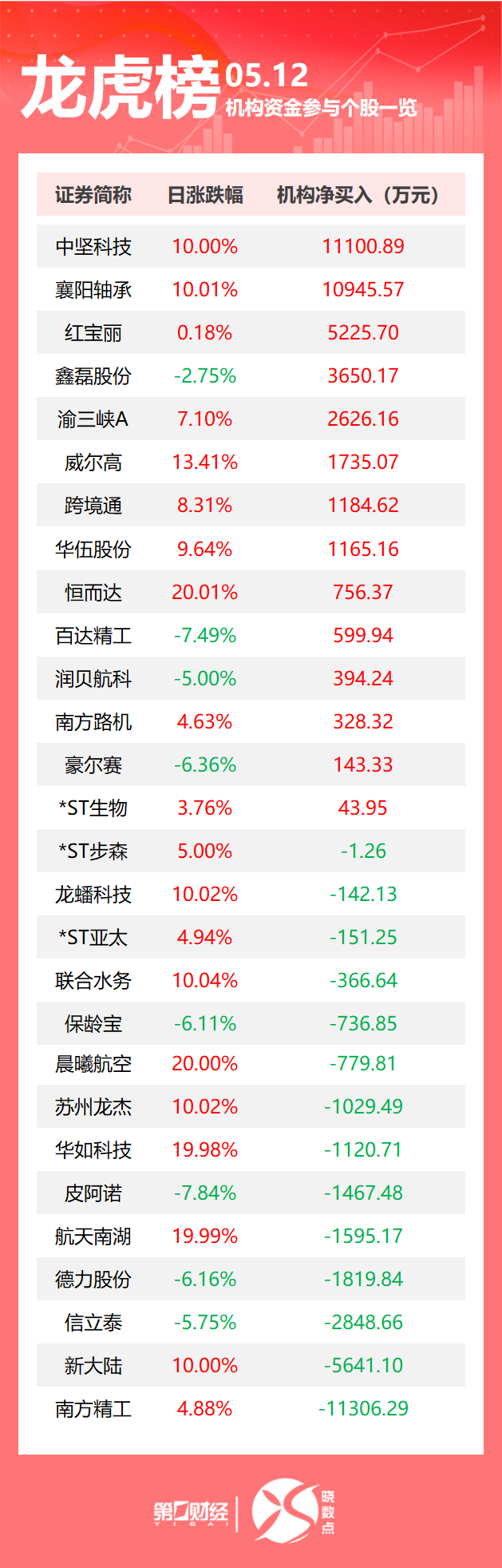 5月12日龙虎榜中,共28只个股出现机构的身影,14只股票呈现机构净买入,14只股票呈现机构净卖出。当天机构净买入前三的股票分别是中坚科技、襄阳轴承、红宝丽;当天机构净卖出前三的股票分别是南方精工、新大陆、信立泰。