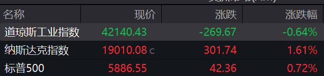 当地时间周二,美股三大指数涨跌不一。道指跌0.64%,报42140.43点;纳指涨1.61%,报19010.08点;标普500指数涨0.72%,报5886.55点。