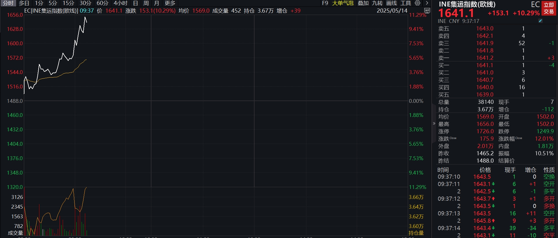 14:59 集运欧线主力合约触及涨停,涨幅15.99%,报1726.0点。
