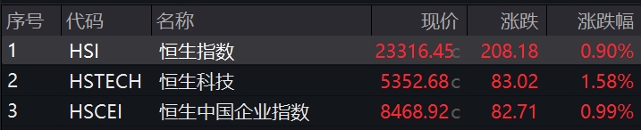 恒指涨0.90%,恒生科技指数涨1.58%。腾讯音乐、京东集团绩后涨超4%。