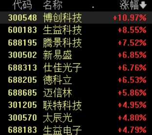 博创科技涨逾10%,生益科技涨逾8%,腾景科技涨7%,新易盛、德科立涨逾6%,联特科技、太辰光涨逾4%。