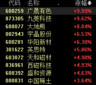 广晟有色涨停,宇晶股份一度涨停,大地熊涨超8%,中国稀土、银河磁体、英思特、金力永磁等跟涨。