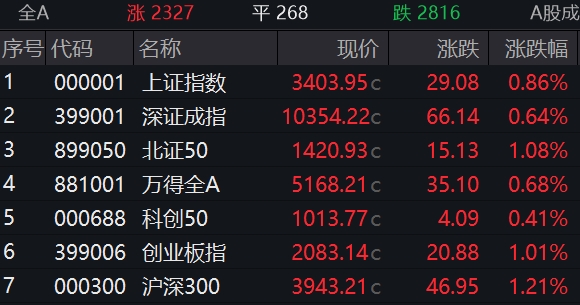 截至收盘,沪指报3403.95点,涨0.86%,深成指报10354.22点,涨0.64%,创业板指报2083.14点,涨1.01%。