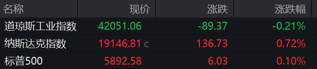 当地时间周三,美股三大指数涨跌不一。纳指涨0.72%,报19146.81点;标普500指数涨0.1%,报5892.58点;道指跌0.21%,报42051.06点。