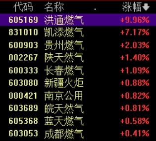 洪通燃气涨停,凯添燃气涨7%,陕天然气、贵州燃气、皖天然气等跟涨。