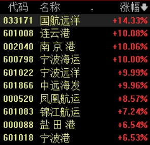 南京港、宁波海运、宁波远洋、中远海发等涨停,国航远洋涨超14%。