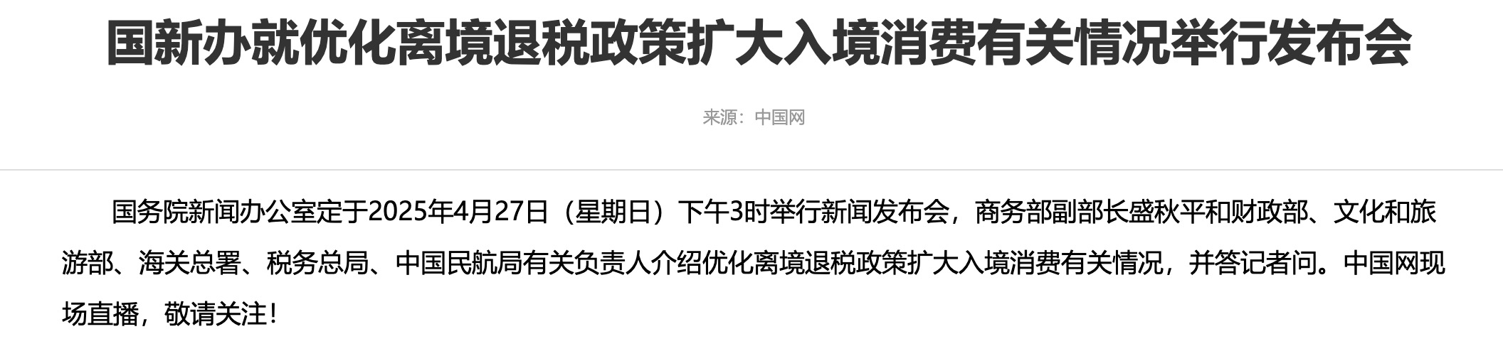 预告|国新办15:00将就优化离境退税政策扩大入境消费有关情况举行发布会